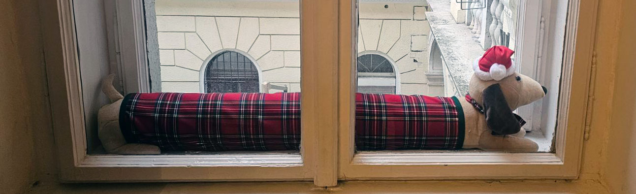 Ez a vidám, kutyás mintájú huzatfogó párna elősegíti a helyiség hangszigetelését is, és nem csupán egy praktikus kiegészítő, hanem egy dizájnos darab, ami azonnal ünnepi hangulatot varázsol az ablakpárkányra.